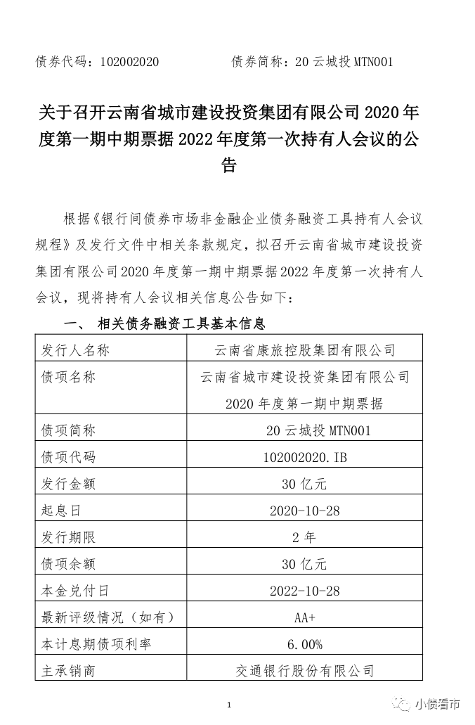 9月15日,交通銀行公告稱,擬于2022年9月20日召開云南省康旅控股集團有限公司(以下簡稱“云南康旅”)“20云城投MTN001”持有人會議,審議《關于豁免本次債券持有人會議通知期限的議案》、《關于辦理“云南省城市建設投資集團有限公司2020年度第一期中期票據”提前兌付的議案》。