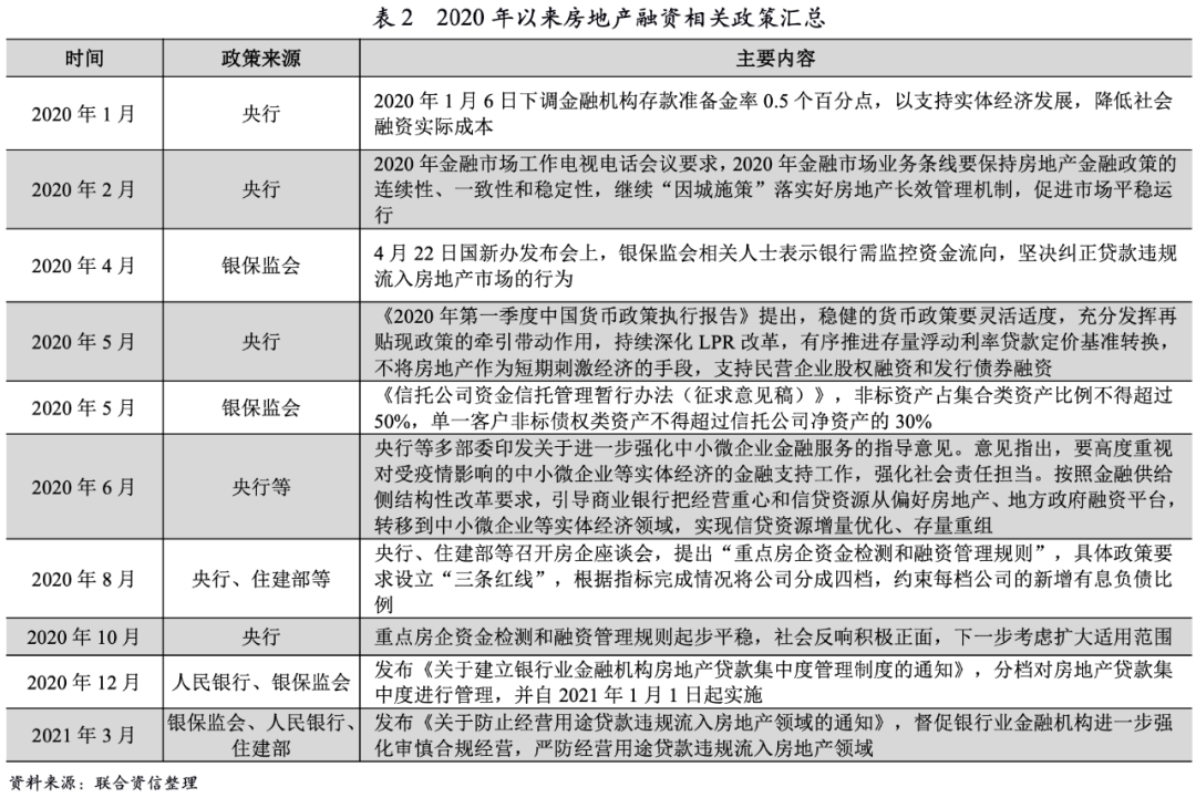 2020年8月20日,住建部和人民銀行在北京召開重點房地產(chǎn)企業(yè)座談會,研究進(jìn)一步落實房地產(chǎn)長效機(jī)制并提出資金檢測和融資管理規(guī)則(簡稱“三道紅線”)。2020年12月,央行聯(lián)合銀保監(jiān)會發(fā)布《關(guān)于建立銀行業(yè)金融機(jī)構(gòu)房地產(chǎn)貸款集中度管理制度的通知》,劃定銀行房地產(chǎn)貸款集中度“紅線”,明確對5檔機(jī)構(gòu)分類分檔設(shè)置明確的房地產(chǎn)貸款占比上限、個人住房貸款占比上限。2021年2月24日,青島市自然資源和規(guī)劃局發(fā)布《堅決落實上級有關(guān)要求,部署2021年住宅用地供應(yīng)工作》,提到嚴(yán)格實行住宅用地“兩集中”同步公開出讓,即集中發(fā)布出讓公告、集中組織出讓活動。隨后,國家自然資源局向全國22個重點城市下發(fā)通知,要求住宅用地出讓工作“兩集中”,不超過3次集中發(fā)布公告和組織出讓活動。