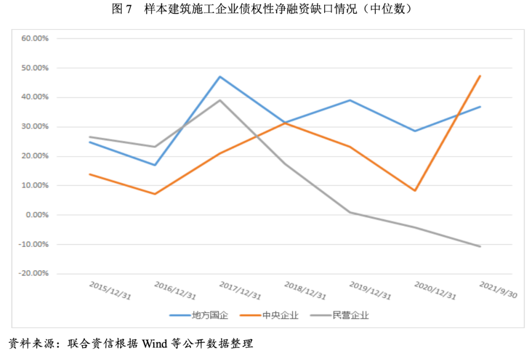 從該指標(biāo)可以看出,中央企業(yè)、地方國企和民營企業(yè)的表現(xiàn)差異較大。中央企業(yè)和地方國企自2015年以來整體融資呈現(xiàn)凈融入資金狀態(tài),但區(qū)間內(nèi)波動較大,主要系與其融資需求相關(guān)。但民營建筑施工企業(yè)該指標(biāo)自2017年以來快速下降,2020年轉(zhuǎn)負(fù),為-4.25%,民營企業(yè)融資情況或受房地產(chǎn)企業(yè)信用風(fēng)險的傳導(dǎo)影響較大。從建筑施工企業(yè)2021年前三季度的債權(quán)性融資情況來看,民營建筑施工企業(yè)債權(quán)融資性缺口繼續(xù)擴(kuò)大,為-10.58%,整體融資能力持續(xù)弱化。因而作為與房地產(chǎn)企業(yè)緊密綁定的建筑施工企業(yè),其融資或受房地產(chǎn)企業(yè)信用風(fēng)險的傳導(dǎo)影響。