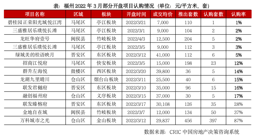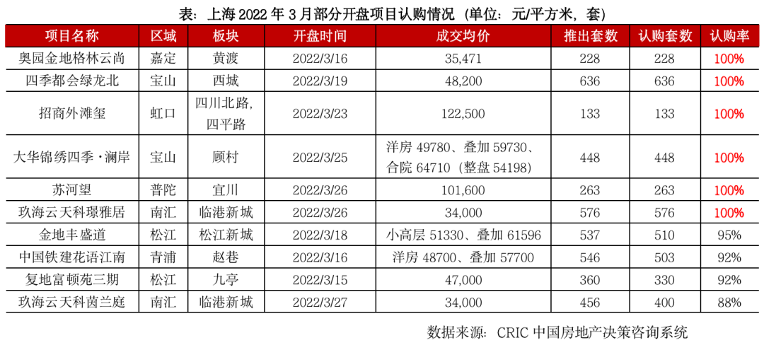 目前來看,3月市場“高熱不退”的主要集中在上海、北京和杭州。上海即便在與日俱增的新冠案例和瀕臨“封城”的重創下,3月開盤去化率依然居不同城市之首,高達90%以上。據CRIC監測數據,上海3月、9個已入市項目中,5個項目觸發積分搖號,認籌率200%左右,入市項目平均去化率在90%以上,即便銷售最差的項目去化率也高達80%以上,市場熱度可見一般。