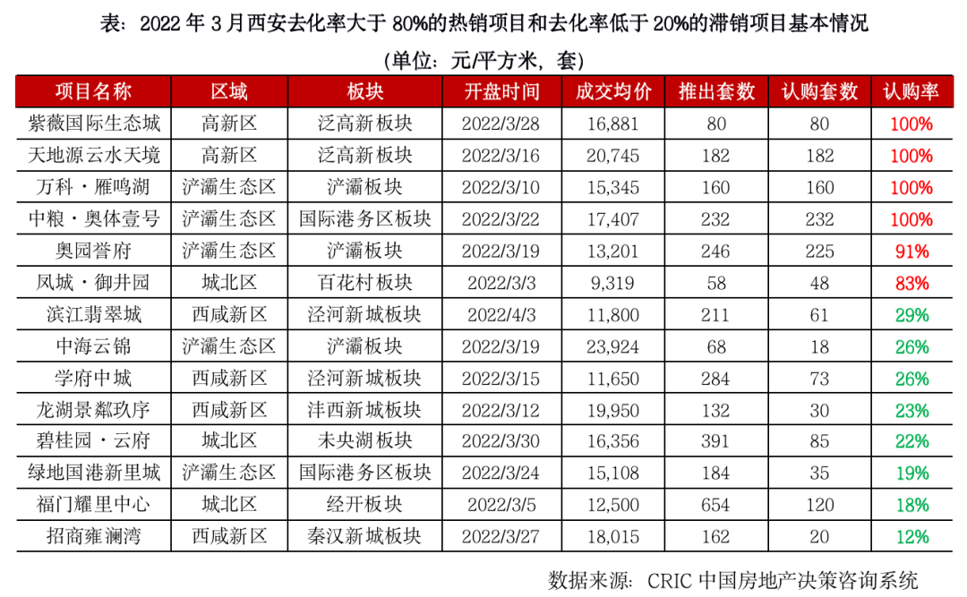 西安受疫情影響,3月23個項目首開或加推,去化情況呈現出顯著的兩極分化:一方面主城區熱度顯著高于西咸新區,地段優質、央企開發、性價比高的項目較多;另一方面,主城區、西咸新區內部各項目之間去化差異也較為顯著,主城區的18個項目,11個項目去化率能夠達到60%以上。這些項目中又有3個項目,開盤當天去化率高達100%。西咸開盤的5個項目中只有1個去化率能夠達到66%,其他四個項目的去化率也只有10%-20%。