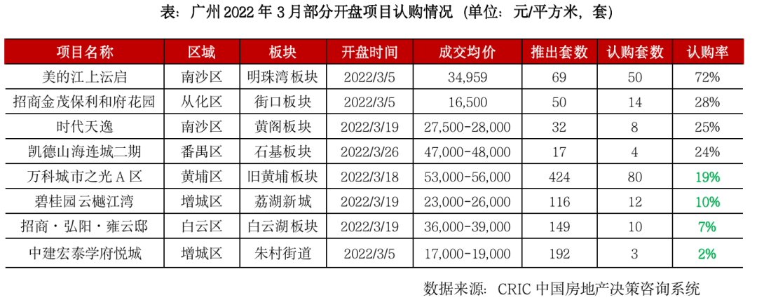 而核心一線廣州和成交常年霸榜的成都、武漢目前整體市場仍處于低迷階段,市場整體觀望情緒相對濃厚。以廣州為例,3月開盤去化率為20%,僅為去年同期的一半,招商·弘陽·雍云邸、中建宏泰學府悅城開盤認購率均不足10%,購房者觀望情緒濃重。