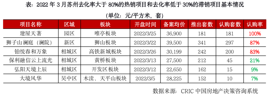 蘇州3月9個項目推售,開盤去化率高達60%,算是近半年去化率較高的月份之一。區域板塊分化行情持續加劇,園區、獅山核心板塊去化表現最好,園區2個價格倒掛盤“日光”;其次是新城板塊,去化率能達到60%-80%;但是絕大多數板塊去化率低于40%,并大量分銷且傭金比例3%-5%。相城區項目在8.5-8.8折的基礎上,還送物業費、車位抵用券、家電等,但去化率低至20%。