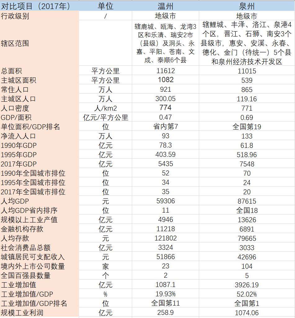 從地理位置上說泉州北有省會福州,南有特區(qū)/計劃單列市/副省級等各類資源加持的廈門,夾縫中求生存的泉州只是一個連一把手都不是省委常委的地級市,各方面都凸顯先天不足。先看人口,城市總面積與總?cè)丝趦傻叵喈?,但是主城區(qū)面積泉州僅為溫州的49.81%;泉州城區(qū)人口約119萬人,為溫州的40%。119萬人是什么概念?都達不到通一條城市輕軌150萬人的要求。