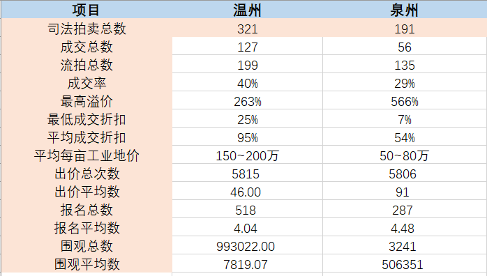 2017年淘寶數(shù)據(jù)中工業(yè)資產(chǎn)已結(jié)束的司法上拍記錄中泉州191個,溫州321個,剔除流拍/撤回/中止等因素抽取成交數(shù)據(jù)做參考。如上表所示:泉州整體上拍賣總量比溫州低41%,成交折扣低41%,成交率低11%,溫州平均每畝工業(yè)用地均價高出泉州近一倍。不論是工業(yè)成交價,平均溢價率,競爭程度,平均工業(yè)用地價格等方面兩地相距甚遠,筆者特意收集了報名人數(shù)/出價次數(shù)/圍觀人數(shù)這3組數(shù)據(jù),發(fā)現(xiàn)幾乎溫州溢價在120%以上的工業(yè)拍品都會有至少3人以上哄搶的場景,完全可以用“網(wǎng)紅”來形容溫州的工業(yè)二級市場。