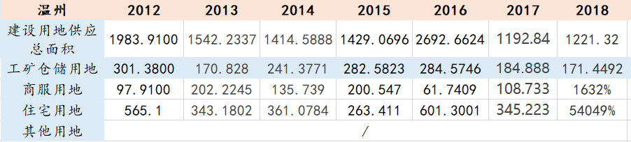 表4(2012年-2018年溫州建設用地一級市場供應數(shù)據(jù)明細)數(shù)據(jù)來源:溫州市國土資源局/中國自然資源部/溫州市統(tǒng)計局(單位:公頃)