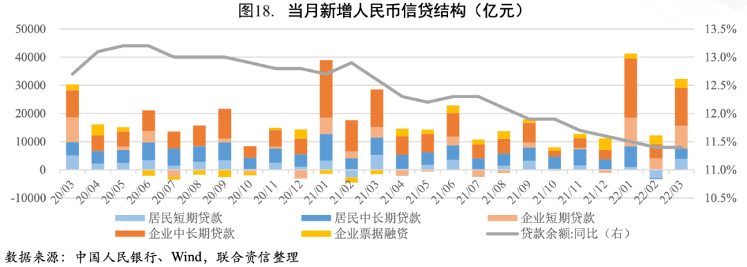 信貸總量回升但結構欠佳,反映出實體經濟融資需求依然較弱。2022年一季度金融機構新增人民幣貸款8.34萬億元,比上年同期多增6636億元;3月末金融機構人民幣貸款余額201.01萬億元,同比增長11.4%,增速與上月末持平,出現企穩現象。從結構看,居民端貸款同比大幅少增,顯示居民消費意愿和購房意愿偏弱,一季度居民短期貸款少增3886億元,中長期貸款少增9100億元;企業端貸款結構進一步短期化,表明企業融資需求依然較低,一季度企業短期貸款同比多增1.03萬億元,票據融資同比多增1.28萬億元,但中長期貸款同比少增5200億元,說明短期貸款和票據融資沖量是企業貸款同比大幅多增的主要支撐因素。展望后市,隨著國內疫情防控形勢逐步好轉、房地產調控政策進一步放松及結構性貨幣政策持續發力,信貸結構有望逐步改善。