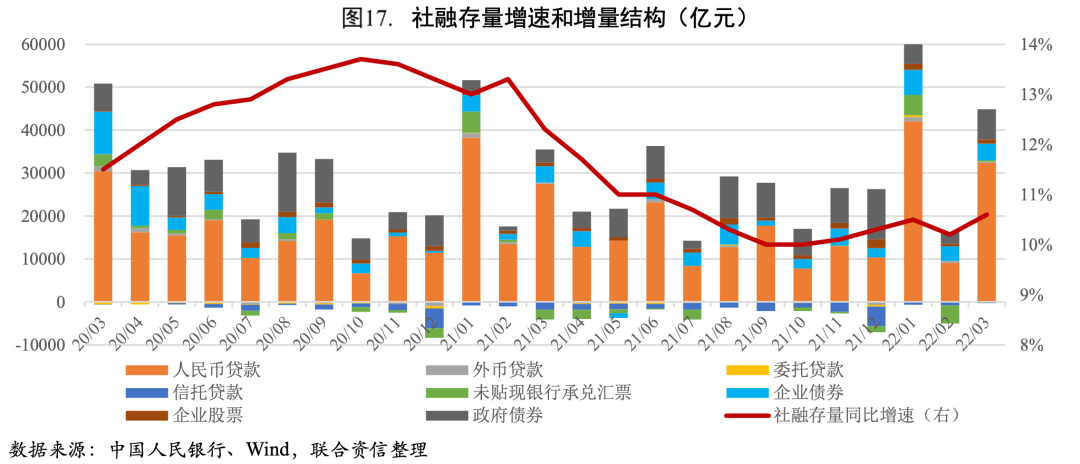 社融總量擴張,財政前置節奏明顯。2022年一季度新增社融規模12.06萬億元,比上年同期多增1.77萬億元;3月末社融規模存量同比增長10.6%,增速較上月末高0.4個百分點。從結構看,財政前置帶動政府債券凈融資大幅增長,是支撐社融擴張的主要動力,一季度政府債券凈融資規模較上年同期多增9238億元。由于從發債到形成實物量之間存在一定時滯,因此當前的高規模發債或對二季度的基建投資形成有利的資金支持。其他支撐因素包括對實體經濟發放的人民幣貸款、企業債券凈融資、信托貸款,一季度較上年同期分別多增4258億元、多增4050億元、少減1879億元。展望后市,在穩增長訴求下積極的財政政策和穩健的貨幣政策將適時加力,推動社融總量繼續擴張。