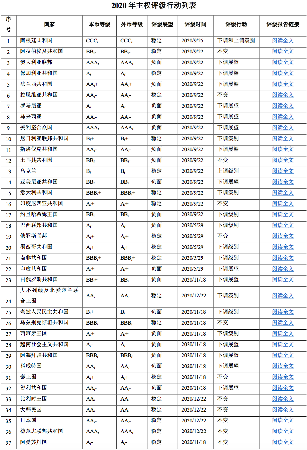 ?阿根廷:2020年4月長期本、外幣信用等級由CCCi下調至Ci,2020年9月長期本、外幣信用等級由Ci上調至CCCi,評級展望為“穩定”