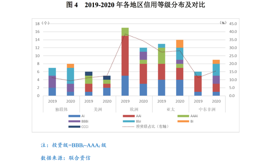 從主權信用級別的地區分布維度看,在受評國家集中的美洲、歐洲、亞太、獨聯體和中東非洲五個區域當中,投資級占比方面,2020年整體投資級別分布區域與2019年大致保持不變,歐洲地區投資級國家占比仍然最高(34%),但較上年下降了5個百分點;其次是亞太地區(28%),同比上升了1個百分點;而獨聯體地區的投資級國家占比最低(9%),同比下降了2個百分點。各地區級別分布狀況變化方面,2020年的各地區的級別分化程度更為顯著,且均呈現出不同程度的級別中樞下移特征。