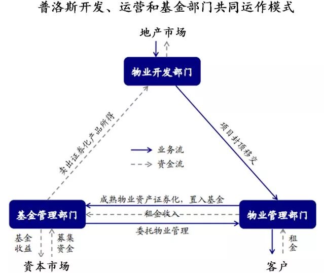 普洛斯通過設(shè)立基金管理平臺將地產(chǎn)開發(fā)、地產(chǎn)運(yùn)營和地產(chǎn)基金管理三項業(yè)務(wù)連接起來,實現(xiàn)了物業(yè)與資本的閉合循環(huán),同時基金管理部門又可收取管理費(fèi)和分紅獲利。