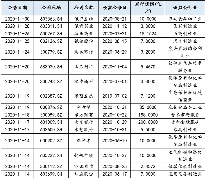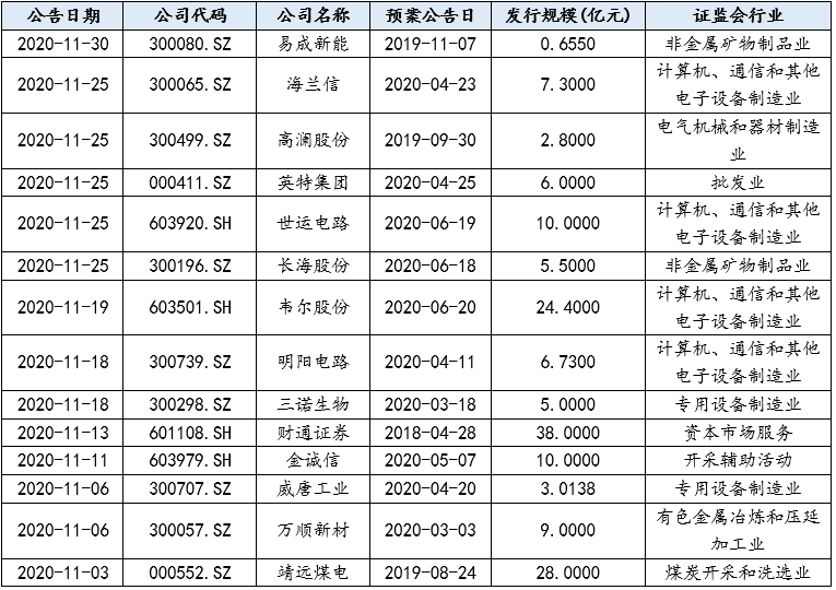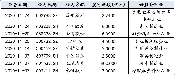 2020年11月可轉債董事會預案公告8只,發(fā)審委通過8只,股東大會通過20只,證監(jiān)會核準14只,具體情況見下表: