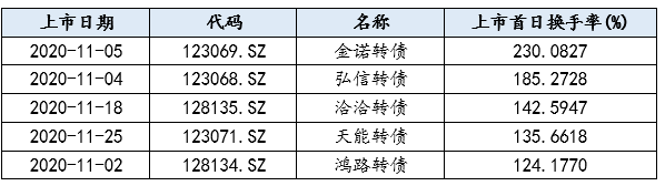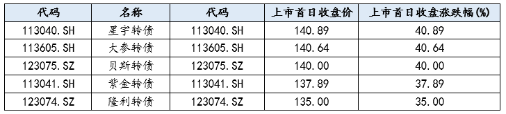 2、上市的21只轉債首日均收漲,漲幅前五的轉債為: