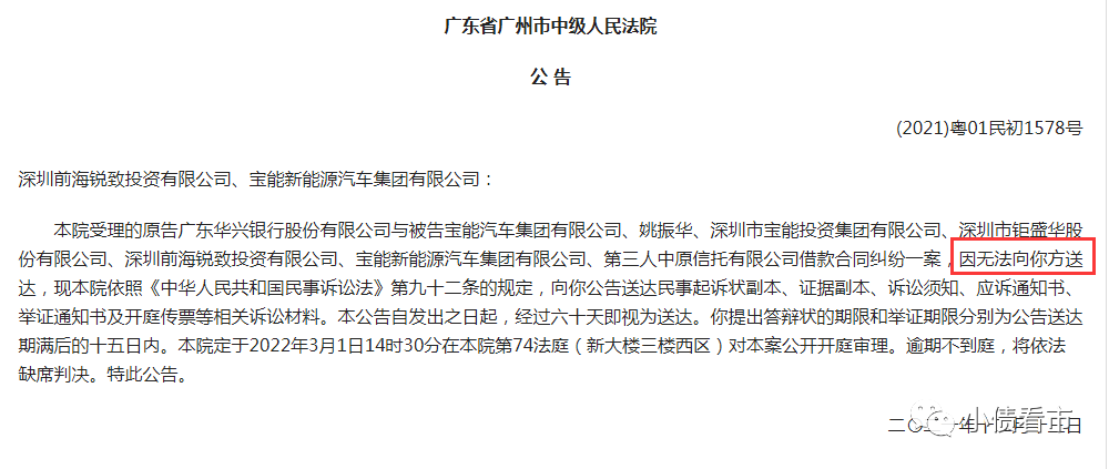 《小債看市》注意到,廣州市中級人民法院2021年12月13日的一份送達公告中,廣東華興銀行與“寶能系”借款合同糾紛一案,顯示無法送達。