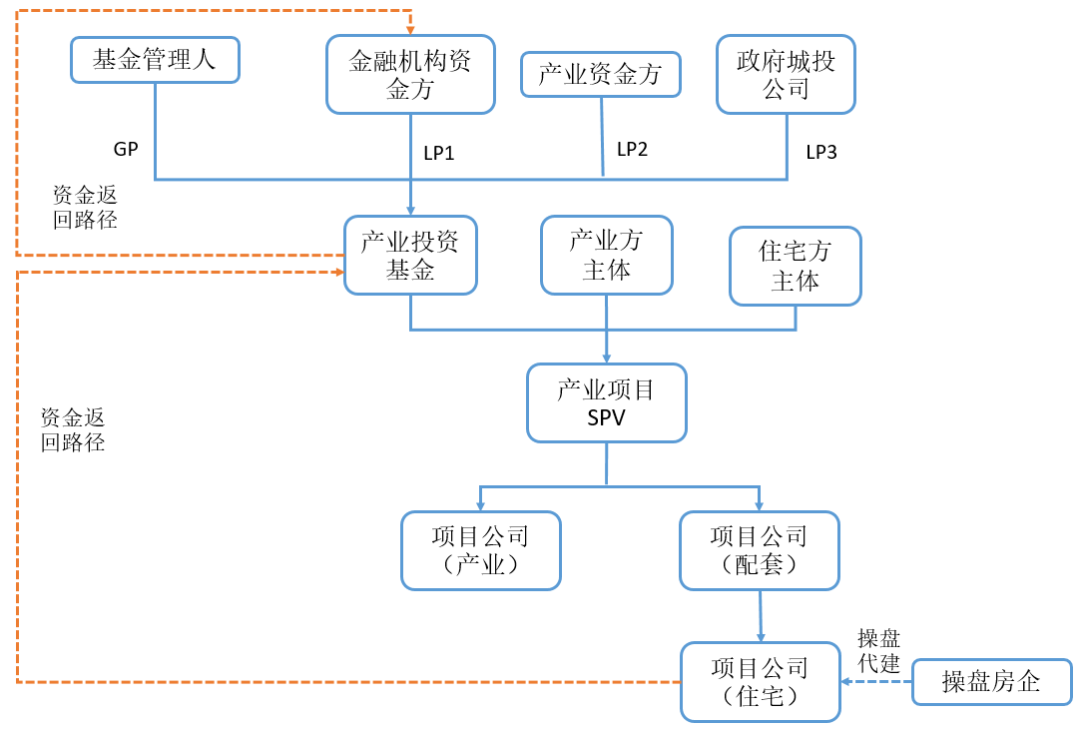 針對部分涉及產業背景的地產項目,筆者認為在投資啟動之初即需要與相關主體(包括但不限于產業方、產業資金方、政府城投平臺、金融機構)等協商,搭建就特定產業項目而設立的產業投資基金,產業投資基金建立后即可作為資金池向產業項目開發提供融資。相關安排如圖所示: