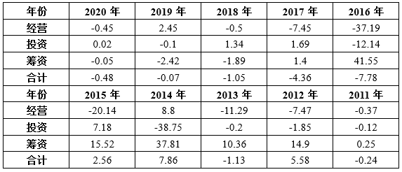 盡管多年大量籌資,信威集團現金流在多數時間仍為負值。且從2011年開始,九年時間未見任何改善,每年都是借新債還舊債來度過危機。