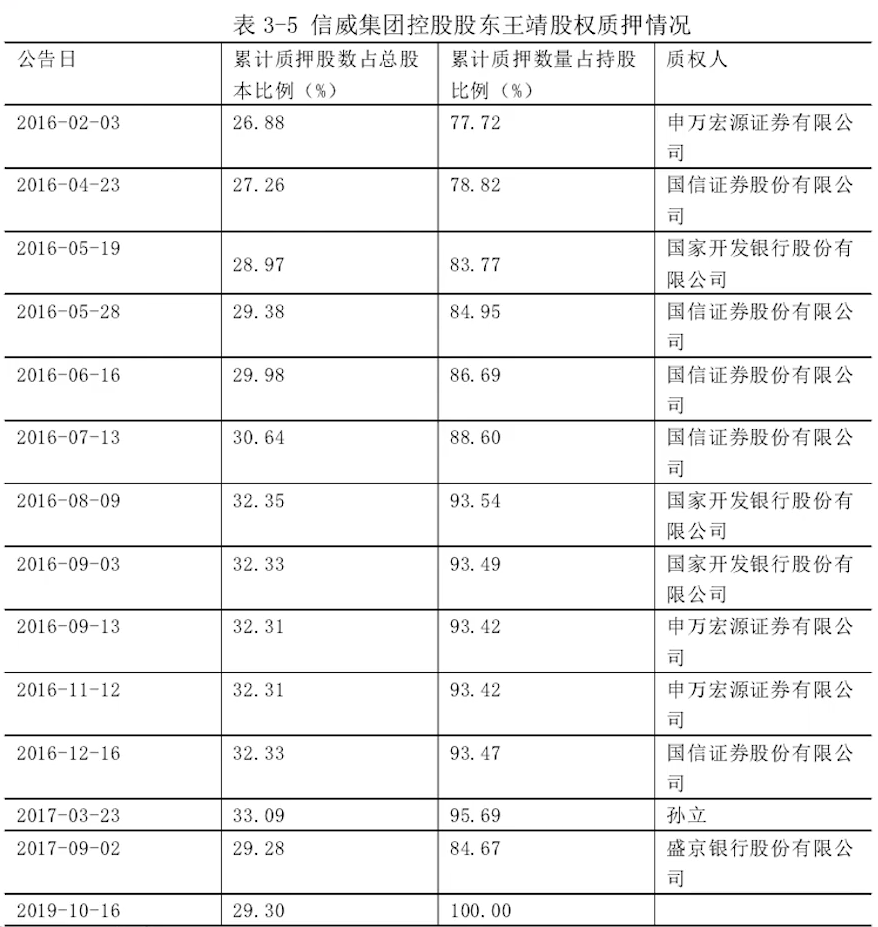 公開資料顯示,2016至2017年間,信威集團董事長兼最大股東王靖陸續將其個人持有股份全部質押,質押機構包括國家開發銀行、盛京銀行和各大證券公司。通過上述股權質押操作,王靖累計獲得現金超百億元。