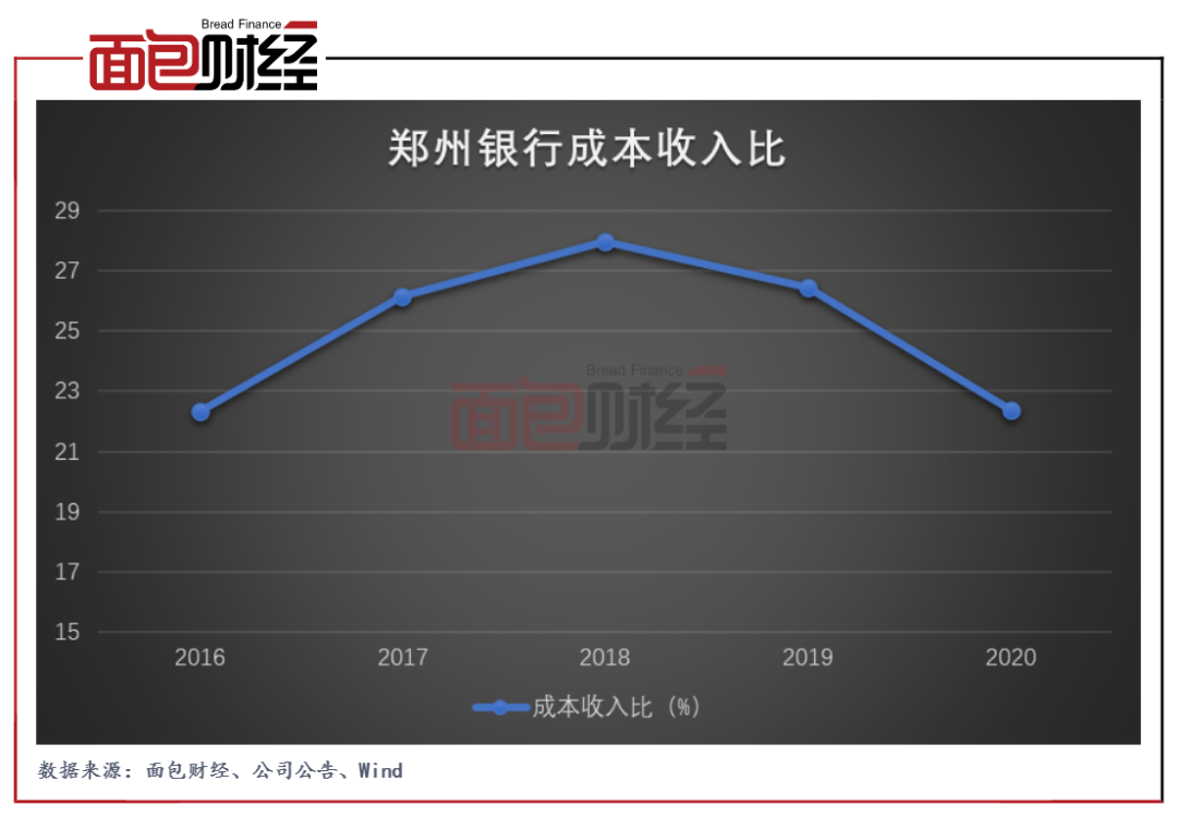 截至2020年末,鄭州銀行的成本收入比為22.40%,較上年末下降4.06個百分點,成本收入比連續(xù)兩年出現(xiàn)下降。