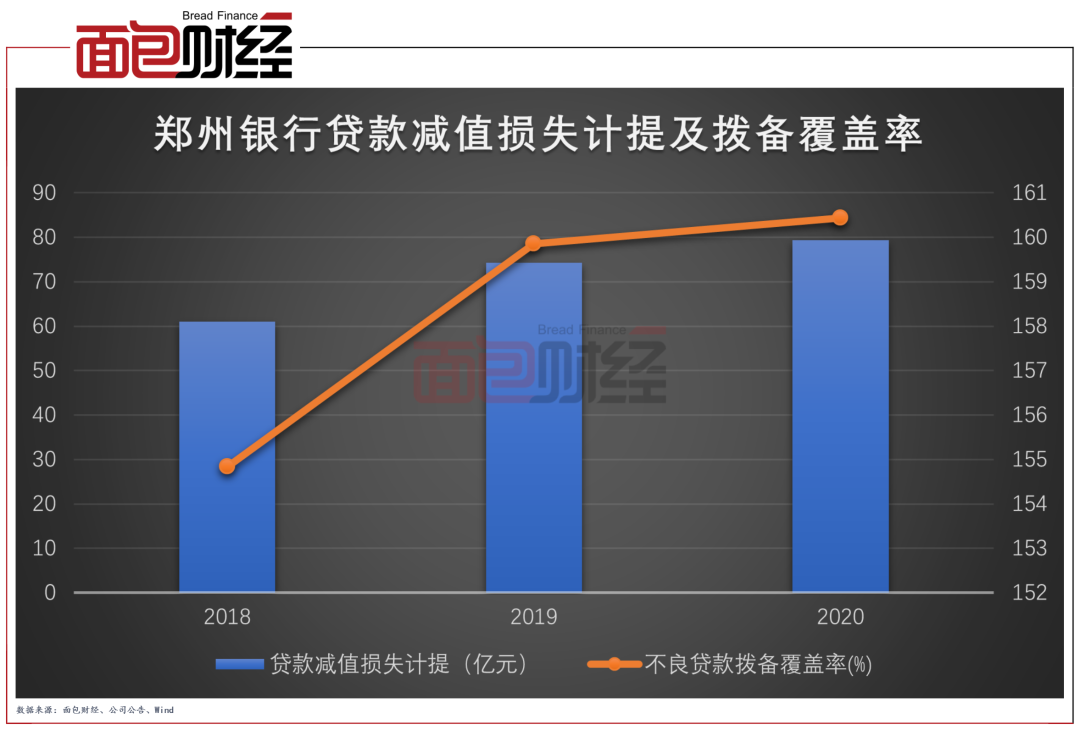 除了不良貸款率,2020年鄭州銀行加大了貸款減值損失計提力度,該行撥備覆蓋率提升至160%以上。
