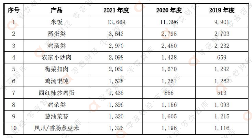 事實(shí)上也確實(shí)如此,招股書顯示,餐廳產(chǎn)品前三位的分別是米飯、蒸蛋類以及雞湯類這類相對較為平價(jià)的菜品。2021年老鄉(xiāng)雞共賣出了1.37億份米飯,3600多萬份蒸蛋以及2900多萬份雞湯。