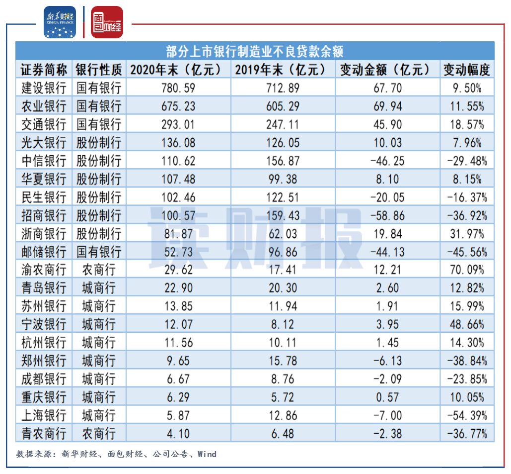 數(shù)據(jù)顯示,截至2020年末,國有銀行的制造業(yè)不良貸款余額整體偏多,其中建行和農(nóng)行的制造業(yè)不良貸款余額分別為780.59億元和675.23億元。股份制銀行中,光大銀行的制造業(yè)不良貸款余額偏多,為136.08億元。城商行和農(nóng)商行的制造業(yè)不良貸款余額總體偏小。