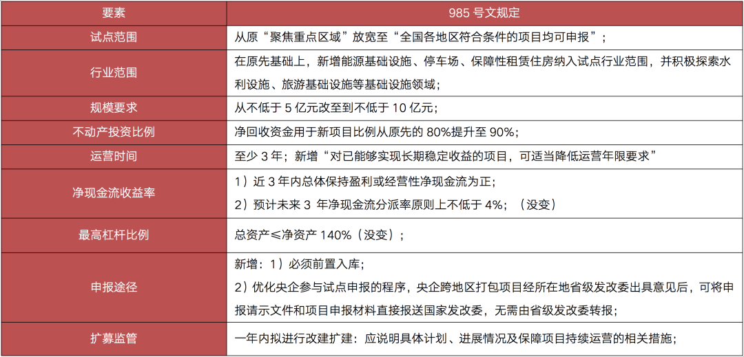 對比發改委958號文件和前期586號文,本次958號文在城市范圍、規模要求、不動產投資比例、申報途徑和擴募監管等方面進行了顯著修訂,并計劃將公募REITs擴容至保障性租賃住房領域。非試點范圍描述也刪除了“公寓、住宅”,調整為“酒店、商場、寫字樓等商業地產項目不屬于試點范圍”,但文件還是在試點范圍明確提出土地用途原則上仍應為非商業、非住宅。
