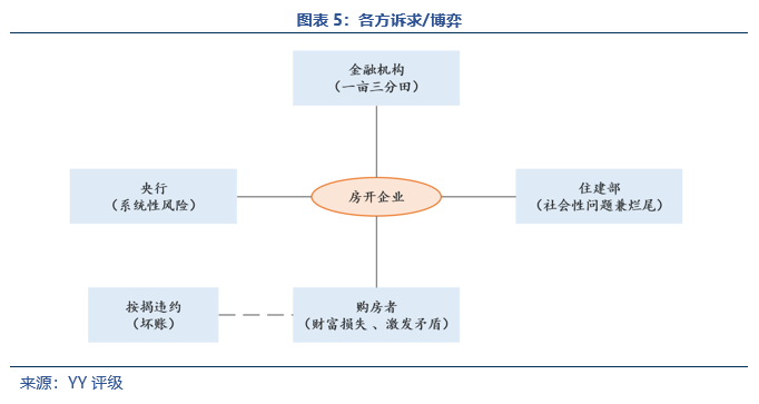 接著,如果違約或者風險處置時,我們引入住建部、金融機構(債委會)、房地產企業、購房者博弈、央行各自訴求: