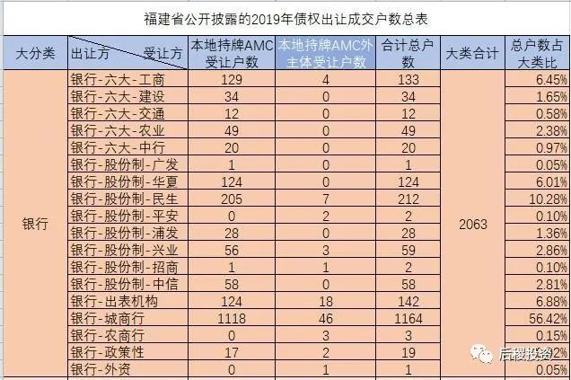 a、單從金額上看,2019年福建省一級市場銀行出讓債權總金額約244億元左右,其他機構約25億元左右,合計269億元左右,由于有關信達的金額數據缺失,故此金額應當更高(信達的實際受讓金額按與其他AMC的戶數比例推算,應當在25-30億之間)。對比2018年的380億元左右,規模大幅下降。