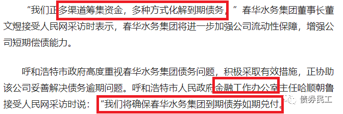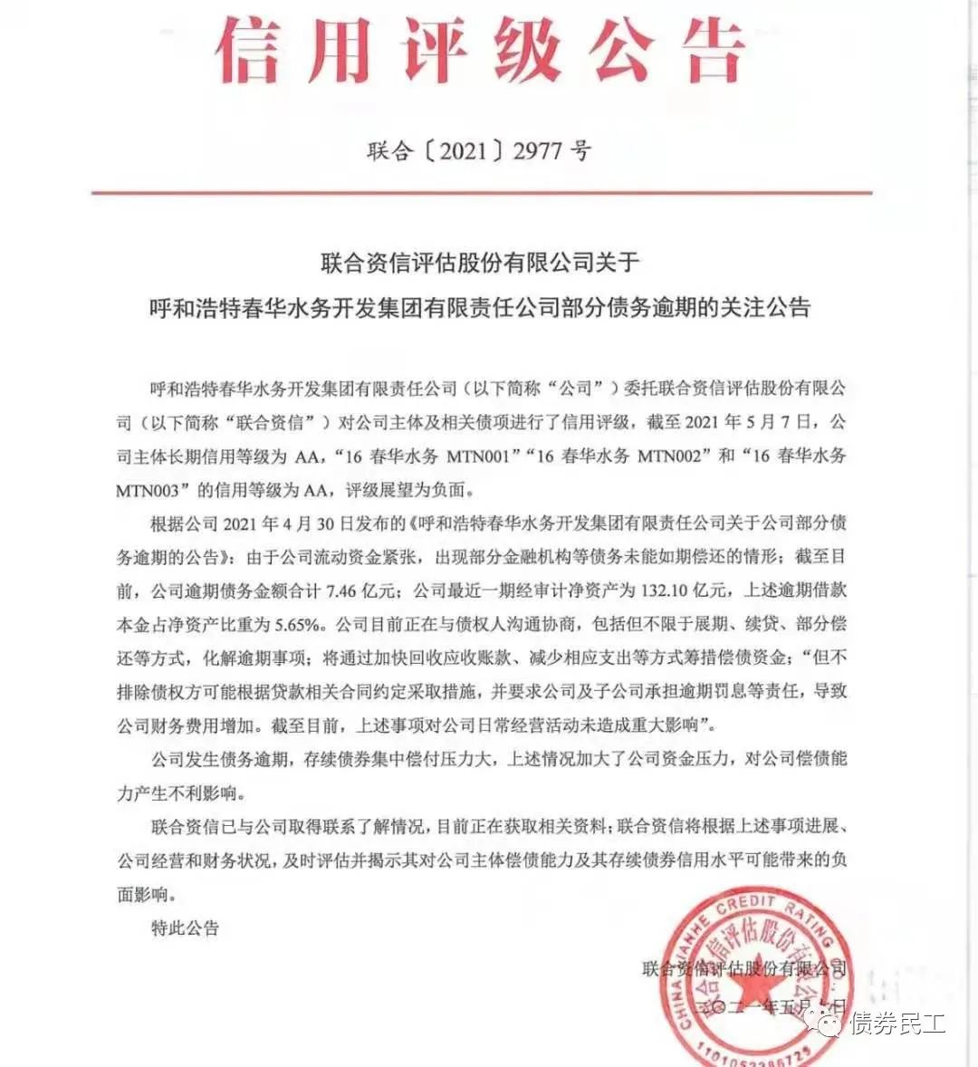 在此之前的2021年5月7日,聯合資信評估股份有限公司披露了《關于呼和浩特春華水務開發集團有限責任公司部分債務逾期的關注公告》,將會持續跟蹤債務逾期事項對公司帶來的影響,但并未下調春華水務的主體信用評級。