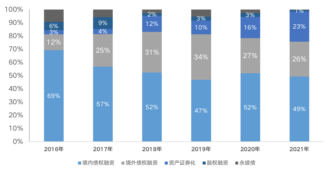 從融資結(jié)構(gòu)來看,2021年融資占比最高的仍是境內(nèi)債權(quán)融資,占比達(dá)到49%。2021年房企境內(nèi)債權(quán)融資同比下降29%至6436億元;境外債權(quán)融資量3435億元,同比下降26%;股權(quán)融資和永續(xù)債分別募集112億元和58億元,降幅較大,分別較同比下降77%和88%,在三條紅線出臺后,永續(xù)債也納入全口徑負(fù)債監(jiān)管,企業(yè)永續(xù)債發(fā)債持續(xù)下降。