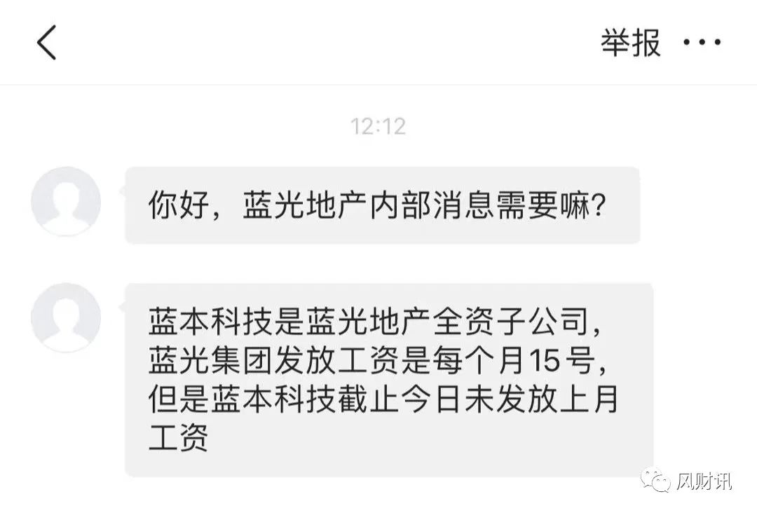 風財訊報道 近日據藍光系員工爆料,藍光發展集團全資子公司“藍本科技”,截止5月18日仍未發放上個月(4月)的工資。藍光集團每個月15號發放工資。