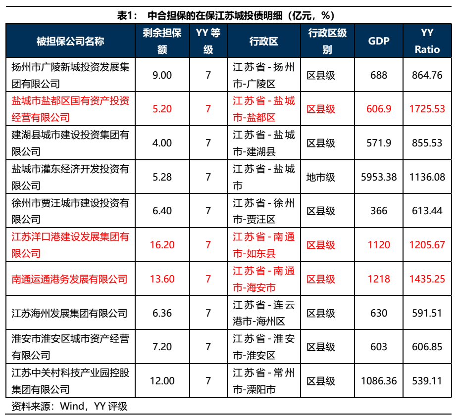 除上述提及的弱資質城投債外,中合在保的其他YY等級達到8的主體還有三個,分別是江西的匯恒置業,濰坊的公信國資和天津的東方財信,剩余擔保額總計8億元。天津和濰坊都是城投的網紅地區,債務壓力較大,涉及到的兩個主體層級也較低,需要重點關注;匯恒置業平臺層級也是較低,且僅是當地的次要平臺,區域重要性不高,也需要持續關注。