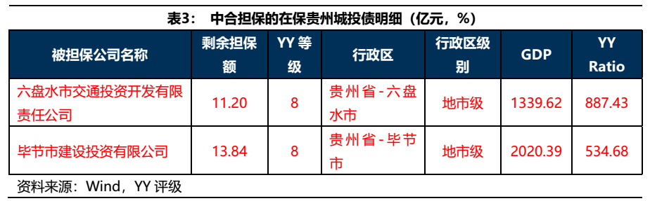 中合在保的貴州弱資質城投債總計25億元,集中在六盤水和畢節兩地,YY等級均為8。作為城投圈里紅得不能再紅的省份,貴州的擔保債自然是重點關注的對象。事實上,中合在貴州擔保的城投債總共就只有這25億,但不出意外資質都令人擔憂??紤]到貴州這兩個主體擔保規模較大,一旦城投債違約的閘門被放開,中合屆時或面臨較大的代償壓力。