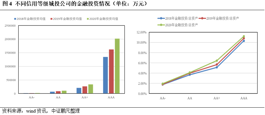 (4)從級別來看,城投公司開展金融投資的活躍度與主體信用級別呈現顯著的正相關。2018-2020年,AA-、AA、AA+、AAA級主體的金融投資規模均值、金融投資/總資產的均值都呈現出由低到高的態勢,且AAA級主體與其他級別相比,優勢極為突出,2020年AAA級主體的金融投資均值高達202.21億元,金融投資占總資產的比重也達到了11.22%(見圖4),這反映出高級別主體相較低級別主體具備更多的能力、資源去開展金融投資,同時也提示了一個關鍵信息:信用等級較低的城投公司對于金融投資應保持足夠的謹慎,避免因能力和資源的缺乏而導致較大的投資損失,從而進一步拖累自身信用資質。
