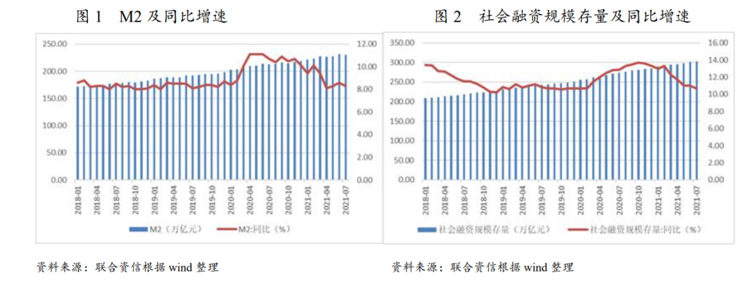 2021年以來,隨著疫情逐步得到控制以及經濟逐漸恢復,央行的貨幣政策由“穩增長”向“防風險和調結構并重”轉變,2021年上半年,M2和社會融資規模增速在經歷了一季度的高點后逐步回落至疫情前水平。
