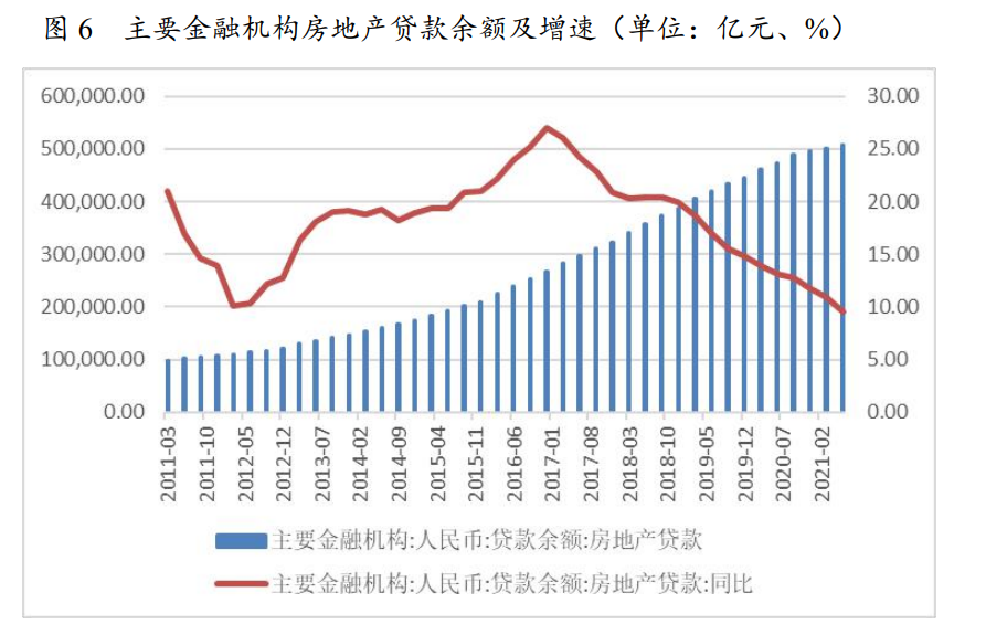 從房地產企業主要融資渠道銀行信貸來看,銀行信貸流向房地產領域的增速持續下降。截至2021年二季度末,國內主要金融機構房地產貸款余額為507800億元,同比增長9.5%,為2011年以來首次低于兩位數,增速創歷史新低。同時考慮到“房住不炒”的整體政策基調以及金融機構房地產貸款集中管理制度的影響,主要金融機構仍將壓降房地產貸款增速。