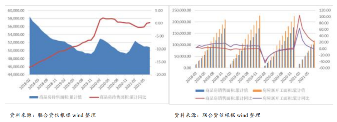 從狹義庫存(已竣工商品房待售面積)指標來看,截至2021年7月底,商品房待售面積50864.00萬平方米,同比增長0.30%;整體看,已竣工商品房庫存年初達到高位,2-5月環比下行,6月以來庫存有所反彈。廣義庫存(累計新開工面積-累計銷售面積)方面,2021年1-7月,全國商品房新開工面積118948.27萬平方米,同比下降0.90%,累計銷售面積101648.18萬平方米,同比增長21.50%,廣義庫存有所增長。