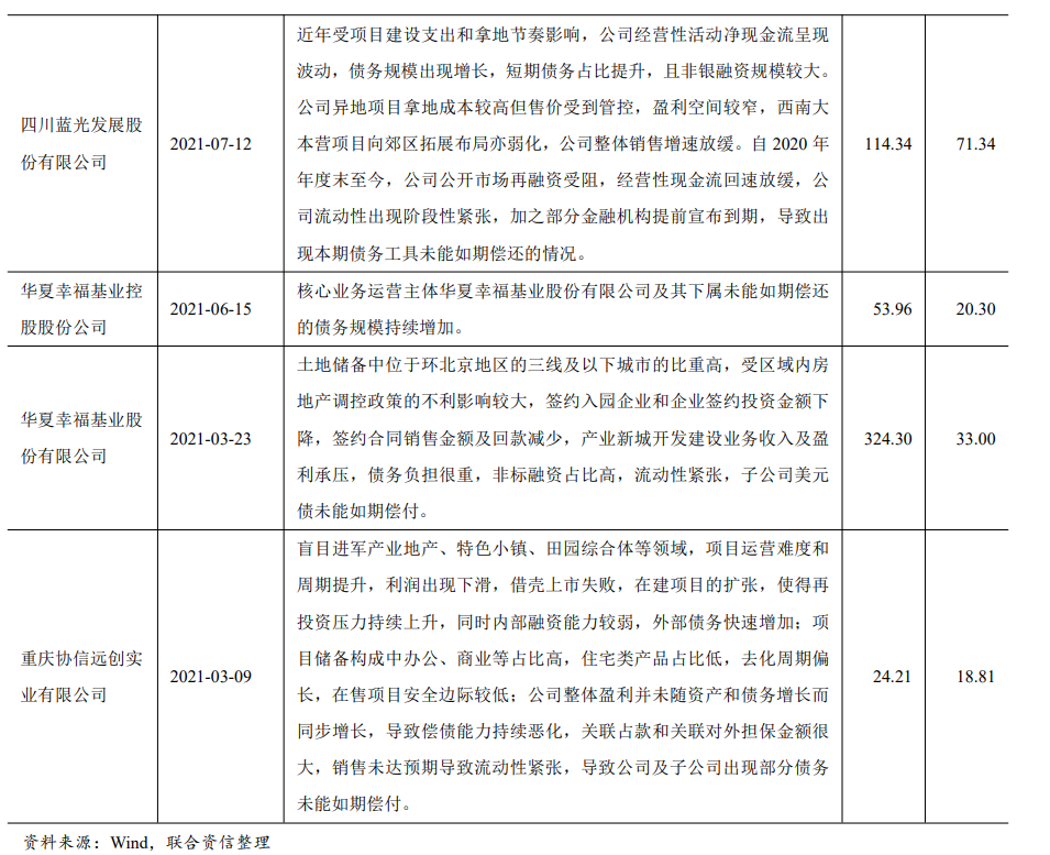 2021年以來,房企債券市場新增實質性違約企業包括四川藍光發展股份有限公司(以下簡稱“藍光發展”)、華夏幸福基業控股股份公司、華夏幸福基業股份有限公司和重慶協信遠創實業有限公司(以下簡稱“協信遠創”),均主要體現出了前期投資擴張激進,項目銷售不及預期,項目回款明顯減少,非標融資占比高,債務負擔重等特征,具體明細如下。