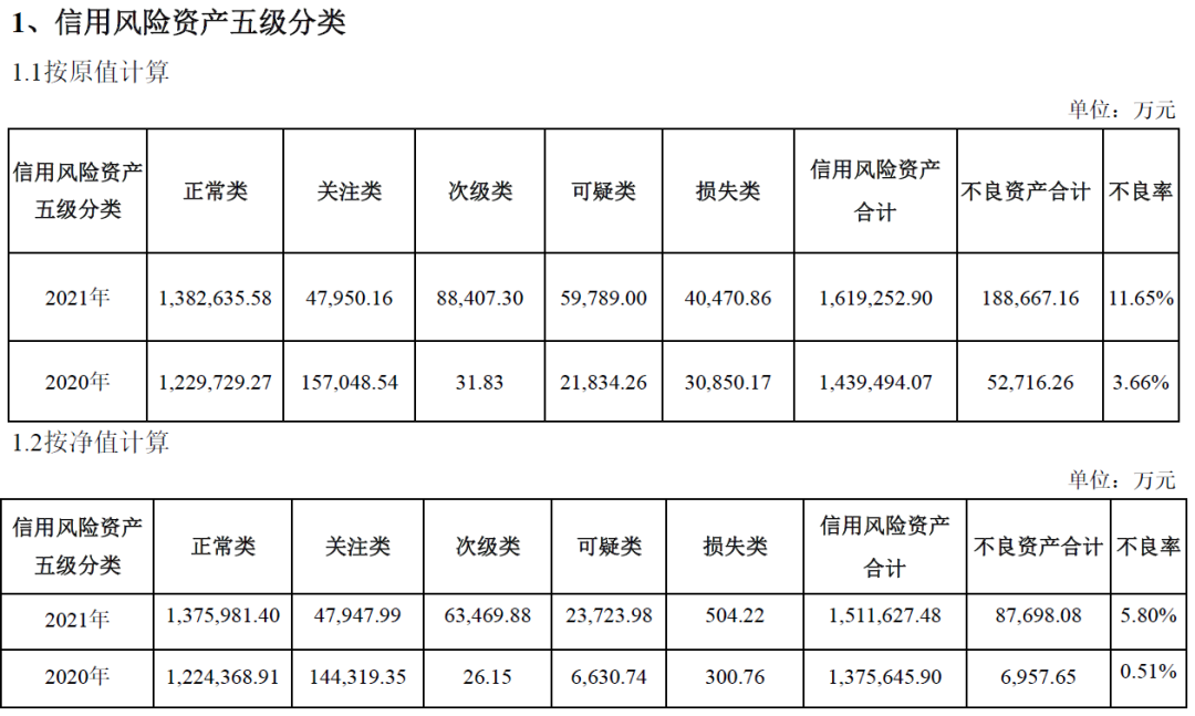 2.在信用風險資產(chǎn)的五級分類中,陜國投報告期內(nèi)的不良資產(chǎn)合計18.86億元,不良率為11.65%,去年的這一數(shù)據(jù)為5.27億元和3.66%。上述數(shù)據(jù)是按原值計算,如果按照凈值計算,2021年不良資產(chǎn)為8.77億元,不良率為5.80%;2020年這一數(shù)據(jù)僅為0.70億元和0.51%。