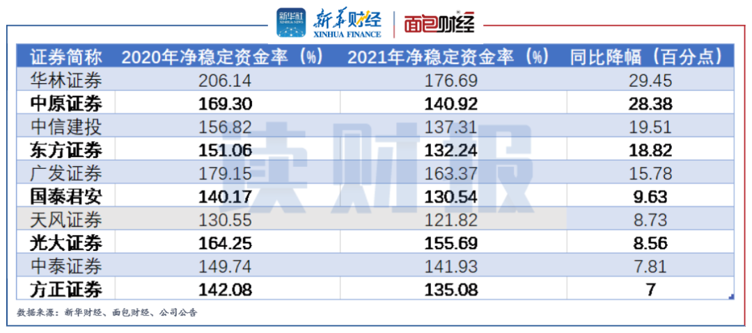圖7:2021年凈穩定資金率同比降幅較大的前十家上市券商