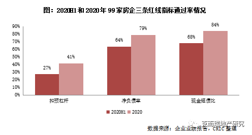 從三個指標(biāo)的通過率來看,均有明顯的提高。2020年底現(xiàn)金短債比的通過率最高,達(dá)到了84%,相比2020年上半年提高了16個百分點(diǎn);此外凈負(fù)債率通過率也同樣較高,達(dá)到了79%,比年中提高了15個百分點(diǎn)。相較之下,剔除預(yù)收款后的資產(chǎn)負(fù)債率的通過率僅有41%,多數(shù)房企仍未達(dá)標(biāo),但相比年中仍有14個百分點(diǎn)的提升。