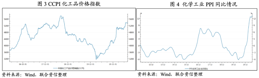 2021年上半年,隨著全球范圍疫情控制及恢復(fù)生產(chǎn),對化工品需求的增加支撐了化工品價格上漲。截至2021年6月底,化工產(chǎn)品價格指數(shù)(CCPI)達(dá)到5100點附近,處于近年相對高位。同期,化學(xué)工業(yè)PPI同比大幅增長,超過2017和2018年的最大同比增幅。