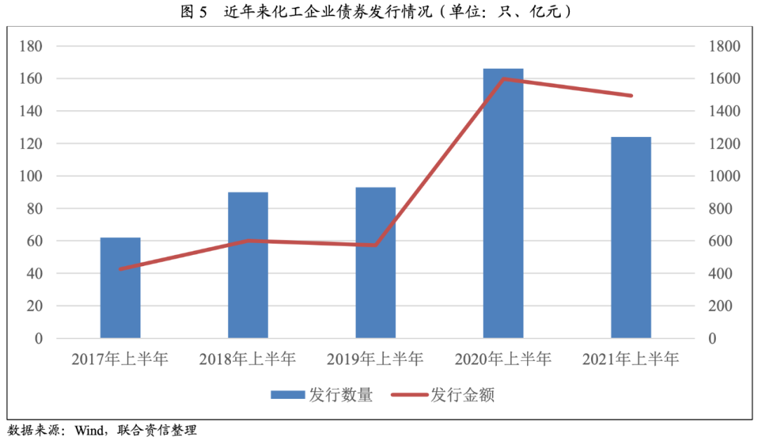 2021年上半年,疫情對中國經(jīng)濟(jì)的影響逐漸消退,中國穩(wěn)健的貨幣政策在保持流動性合理充裕的同時,強(qiáng)化了對實體經(jīng)濟(jì)、重點領(lǐng)域以及薄弱環(huán)節(jié)的支持。具體到信用債方面,2021年上半年,化工企業(yè)信用債的發(fā)行規(guī)模同比有所下降,但仍處于近五年相對高位。通過對申萬化工分類數(shù)據(jù)整理,截至2021年6月底,化工企業(yè)發(fā)行各類信用債券(全部市場,含可轉(zhuǎn)債和私募債,下同)124只,同比減少42只;發(fā)行規(guī)模1494.40億元,較上年同期下降6.46%,從發(fā)行量到發(fā)行規(guī)模同比均有所下降,但均已超過新冠肺炎疫情爆發(fā)前水平。其中,發(fā)行量較2017年同期增加62只,發(fā)行金額較2017年同期大幅增長251.46%,化工行業(yè)信用債融資熱情較高。