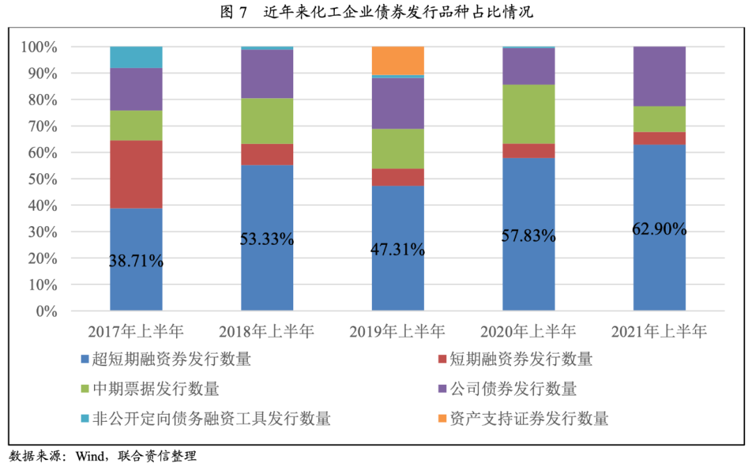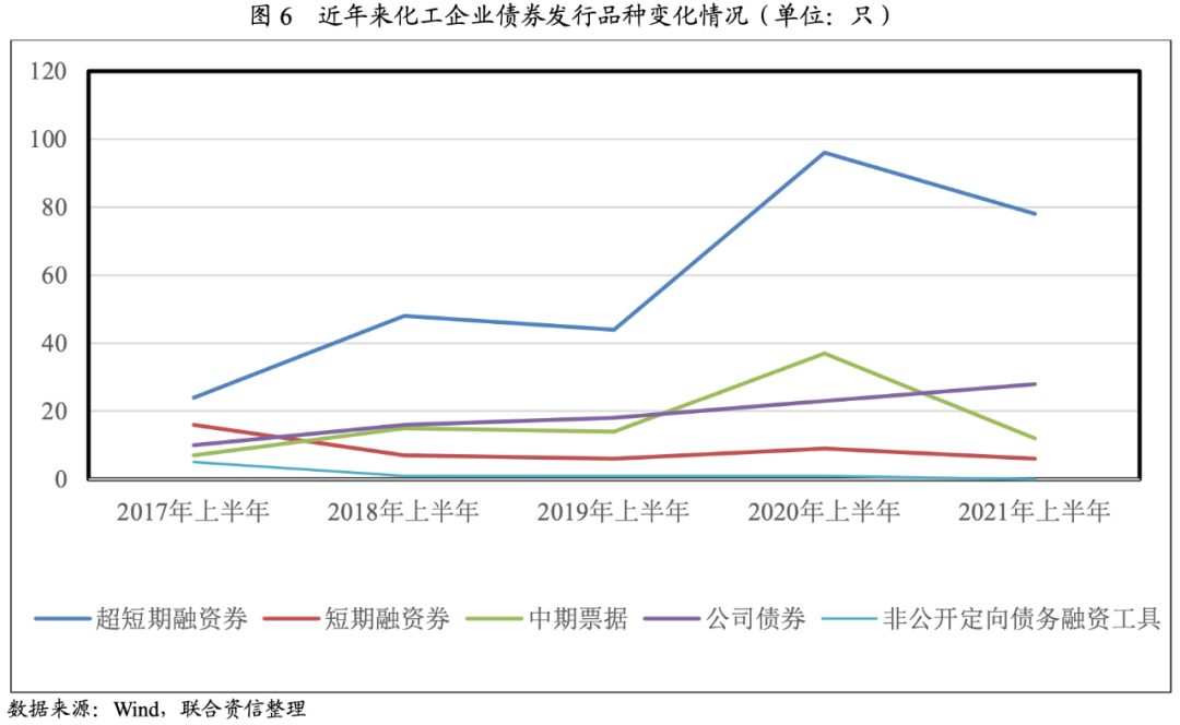 從發(fā)行品種來看,2021年上半年,化工企業(yè)發(fā)行信用債券中,超短期融資券同比減少18只,但仍為第一大品種,共計發(fā)行78只,占62.90%。公司債券發(fā)行量居第二位,共計發(fā)行28只,同比增加5只,占22.58%。其余為中期票據(jù)和短期融資券,分別發(fā)行12只和6只。2017年以來,超短期融資券均為化工行業(yè)上半年債券發(fā)行的第一大品種,且2021年占比達(dá)近年來高位;公司債券發(fā)行量近年來逐年增長,2021年上半年發(fā)行量占比首次超過20%。