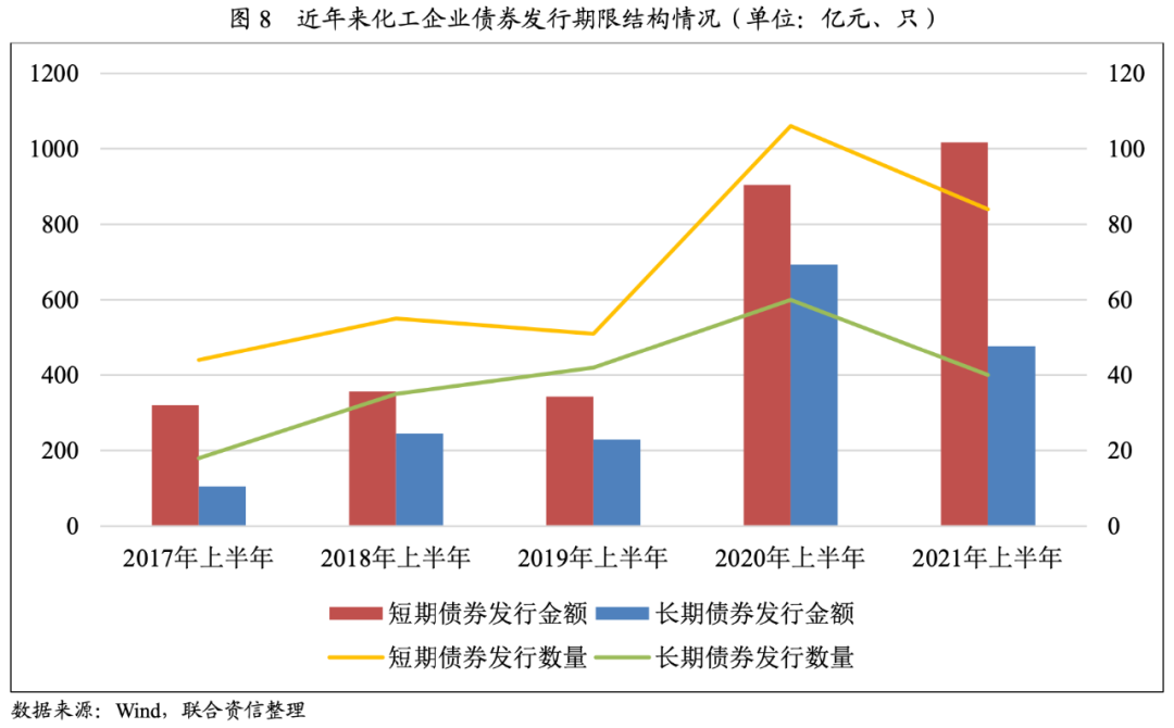 2021年上半年,主要化工品量價齊升,化工企業(yè)經(jīng)營業(yè)績顯著改善,行業(yè)景氣度整體上行。化工企業(yè)信用債發(fā)行規(guī)模同比有所下降,但仍處于近五年相對高位,同時,化工企業(yè)債券發(fā)行期限仍以短期為主,雖然保持較大規(guī)模凈融資態(tài)勢,但市場資金向高信用等級債券傾斜。截至2021年6月底,化工行業(yè)存續(xù)債券規(guī)模為近年來同期相對高位,頭部企業(yè)債券市場融資占比提高。化工行業(yè)無新增違約主體,但行業(yè)內(nèi)企業(yè)信用等級調(diào)整以下調(diào)為主,存續(xù)債券發(fā)行人信用等級區(qū)分度有所提高。