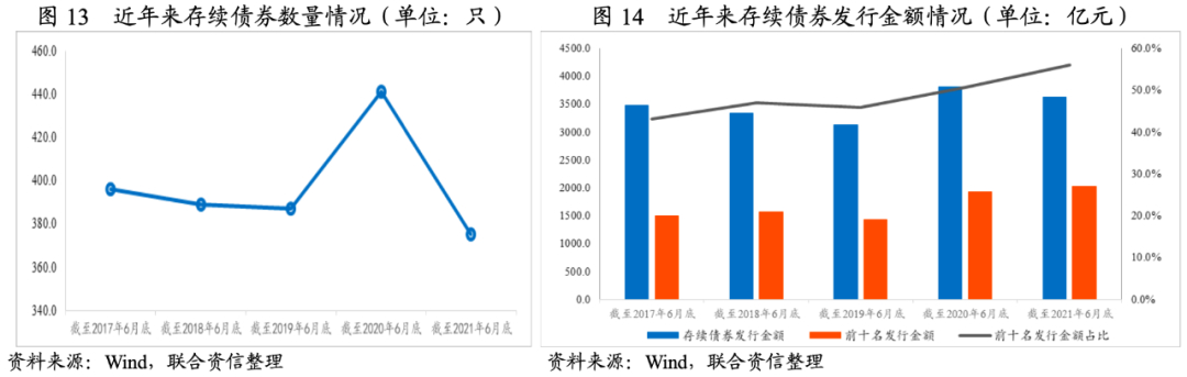 截至2021年6月底,化工行業(yè)存續(xù)債券數(shù)量375只,存續(xù)債券余額3627億元,從近五年情況來看,存續(xù)債券余額為近年來同期高位,僅次于2020年,但同期存續(xù)債券數(shù)量為近五年最低數(shù)值,平均單只債券規(guī)模為歷史同期峰值。此外,化工行業(yè)前十名發(fā)行金額及占總發(fā)行金額比例整體呈上升趨勢,截至2021年6月底,化工行業(yè)前十名發(fā)行金額達(dá)2034億元,占總發(fā)行金額的56.07%,發(fā)行主體集中度愈發(fā)提高,中小企業(yè)的信用債市場的發(fā)行難度在加大,存續(xù)規(guī)模居前的化工企業(yè)有中國石油化工股份有限公司(540.00億元)、中國化工集團(tuán)有限公司(420.00億元)和中國藍(lán)星(集團(tuán))股份有限公司(205.00億元),恒力集團(tuán)有限公司(175.00億元)、浙江恒逸集團(tuán)有限公司(135.00億元)、浙江榮盛控股集團(tuán)有限公司(117.00億元)、桐昆集團(tuán)股份有限公司(67.00億元)、煙臺國豐投資控股集團(tuán)有限公司(120.00億元)、萬華化學(xué)集團(tuán)股份有限公司(79.80億元),主要為融資能力和融資需求較高的大型央企集團(tuán)、大型煉化企業(yè)及大型化工新材料公司。