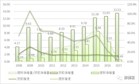 圖3.2008-2017年銀行理財凈增量、金融機構貸款凈增量及增速