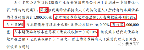 威海產(chǎn)業(yè)投資集團有限公司(原名為“威海市國有資本運營有限公司”,以下簡稱“威海產(chǎn)投”)的資產(chǎn)置換議案就未通過了。根據(jù)威海產(chǎn)投3月15日披露的《關(guān)于召開威海市國有資本運營有限公司公開發(fā)行2018年公司債券(第一期)2021年第一次債券持有人會議的公告》,擬通過置產(chǎn)置換實現(xiàn)優(yōu)化資產(chǎn)結(jié)構(gòu)的議案未通過。根據(jù)會議公告結(jié)果,同意票占存續(xù)本金總額的18%,棄權(quán)票占本金總額的10%,棄權(quán)票0張,議案未通過。本次參會持有人會議的比例合計為28%,這個比例也算是非常低了。