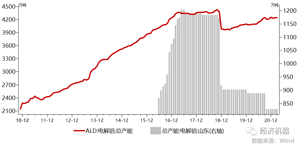 2)我國供給側改革。這個是過去幾年,影響大宗商品供給的最重要因素。過去幾年,我國對鋼鐵、水泥、電解鋁、玻璃等行業進行了力度空前的供給側改革,核心就是去產能。在需求保持穩定,甚至小幅增長情況下,供給持續壓縮,使“4萬億刺激”導致的產能過剩問題近年來顯著緩解。以電解鋁為例,“合規產能”從最高的4428萬噸,一度降至3963萬噸。考慮到之前有很多不合規產能在運行,實際去產能力度更大。其中山東產能從1200萬噸,降至828萬噸,降幅高達30%。