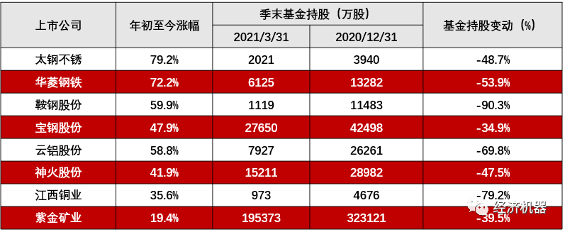 這波大宗商品暴漲,起始于2020年3月疫情期間,主要是政策刺激預期疊加疫情帶來的供應鏈中斷。從個股的機構持股看,2020年四季度,大部分漲勢較好的周期龍頭基金持股都出現了明顯增加,表明雖然權益市場較商品市場滯后兩個季度啟動,但也基本有效地反映了基本面的改善。